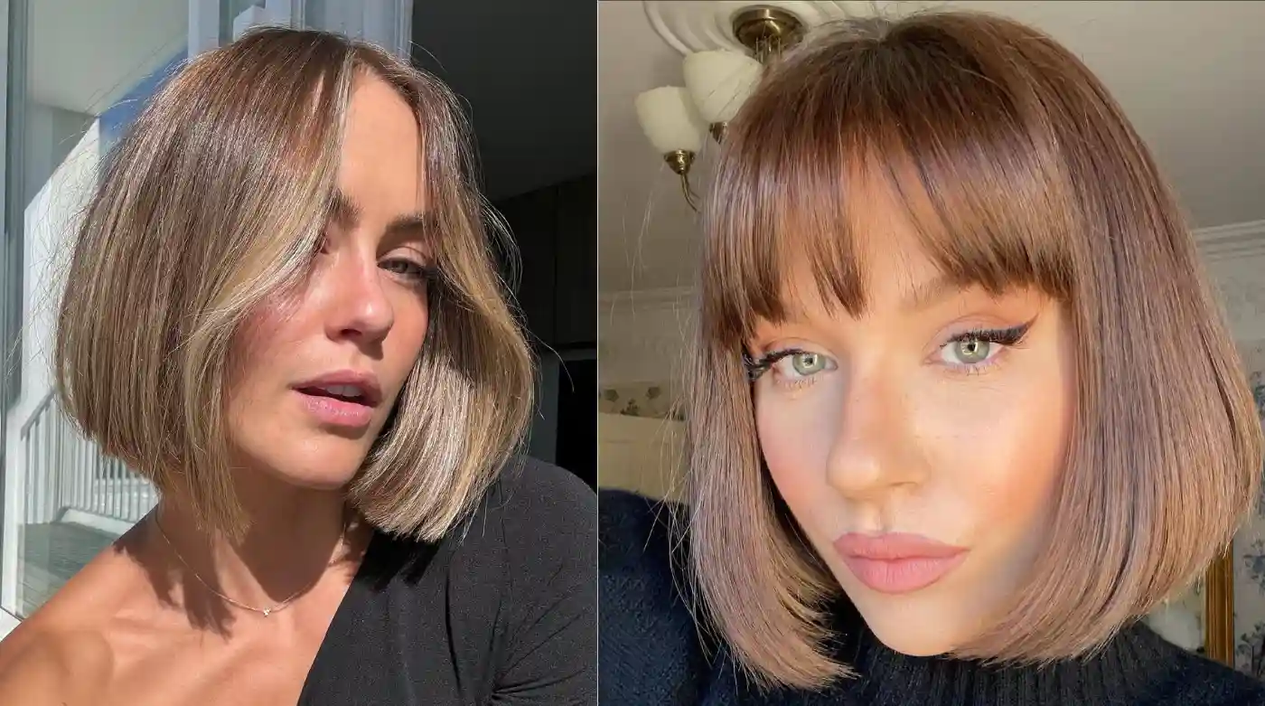 They're cut straight across, this creates a bold, dramatic look. The bob itself can be straight or textured. The bangs are the star here, they make a big statement.