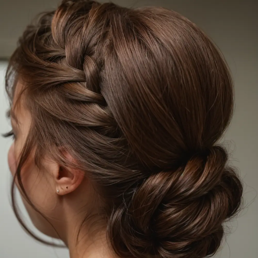 It is a cute bun hairstyle that's absolutely formal and easy to manage, even if it's the first time you do an updo on your own. This side braid with bun hairstyle best suits medium to long hair.