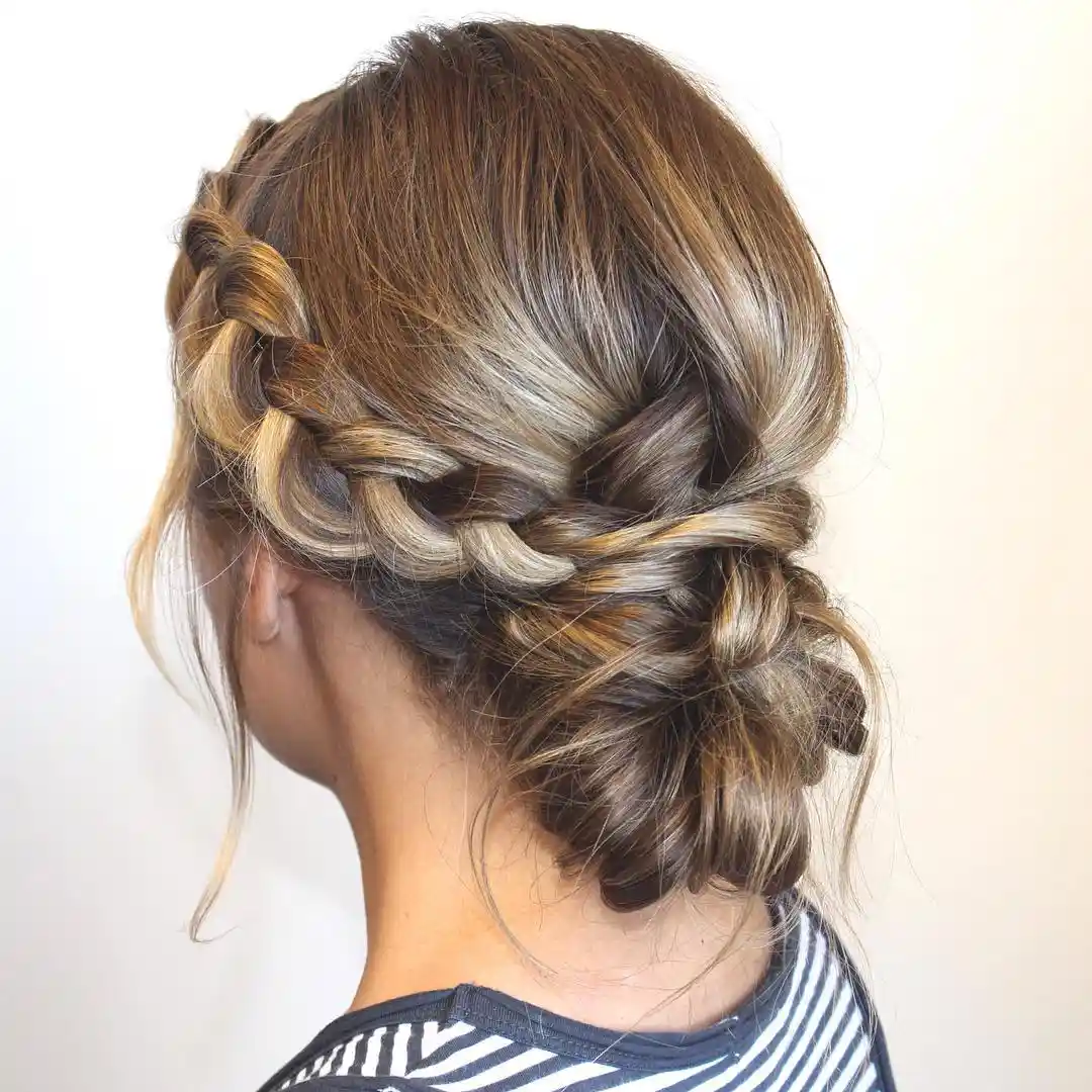 The twisted bun and cute crown braid is the best combination for hot summer days. This hairstyle works on both medium and long hair.
